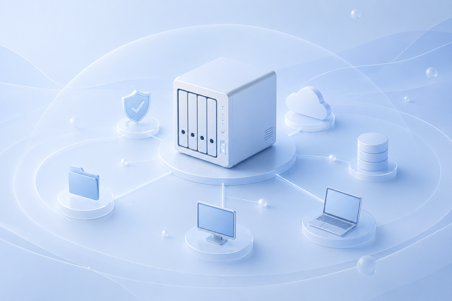 首先说一下 NAS 是什么东西,它的全称是 Network Attached Storage,说人话就是一台独立的设备,它能插上许多硬盘,通过网络提供存储服务,而不是你的电脑直接连接硬盘。由于 NAS 系统提供了许多丰富的能力,例如权限、备份、快照,你可以省去许多数据相关的解决方案的调研和配置的时间,因为这些能力在 Mac 和 PC 上或许没那么容易实现。此外,你还可以通过 RAID 技术来将多块硬盘合并成一块硬盘来使用,并通过数据冗余实现当部分硬盘损坏时,整个 RAID 阵列仍然可以继续运行。